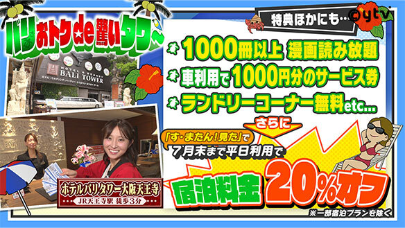 天王寺区悲田院町8-1JR天王寺駅北口から徒歩3分https://www.balitower.jp/ ★視聴者特典★「す・またん!を見た」で『7月平日限定20%OFF(ホテクレ付き)』