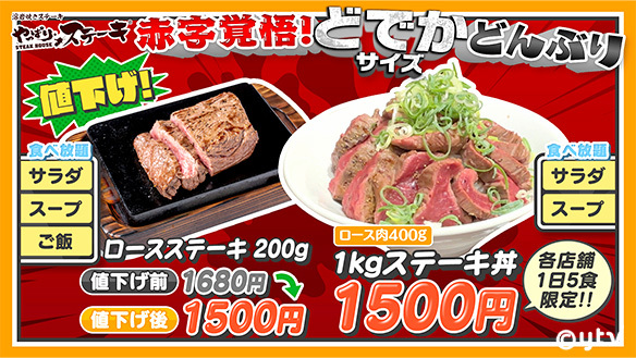 1㎏ステーキ丼に関わらず注文時に「すまたんを見た」で