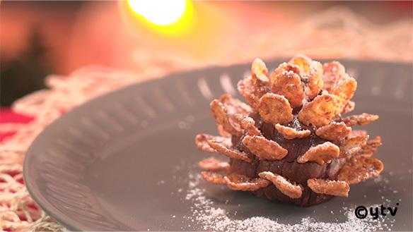 ③チョコフレークを下から上に向かって刺していき、松ぼっくりのようにする。