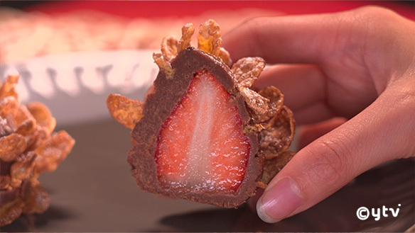 ・チョコパイ(4個) ・牛乳(小さじ2) ・イチゴ 4個 ・チョコフレーク(適量) ・粉糖(適量)