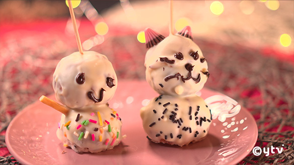 ④溶かしたホワイトチョコレートを周りにつけて、プリッツやチョコペンなどで、かわいく自由にアレンジすれば完成。