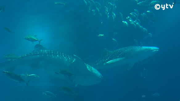 この水槽の中で立ち泳ぎをする魚はジンベエザメだけなんだって。