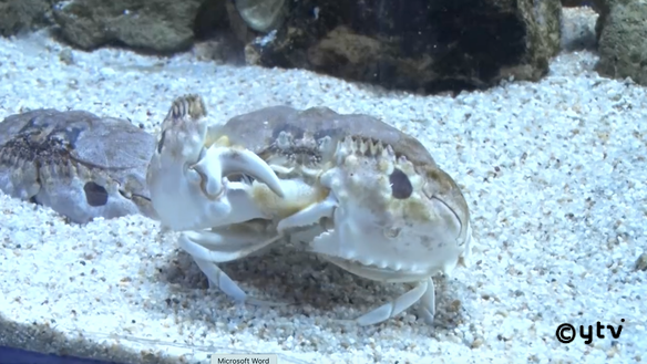 メガネカラッパはヤドカリや巻貝が大好物で、右のハサミがまるで缶切りのようになっているので、それを上手に使って貝を割ります。