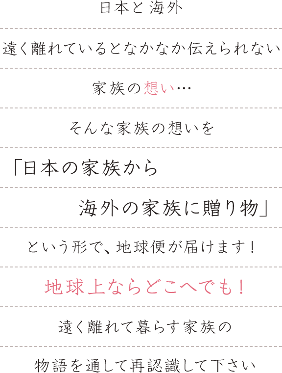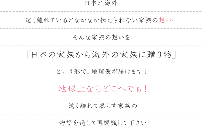 日本と海外 遠く離れているとなかなか伝えられない家族の想い… そんな家族の想いを 「日本の家族から海外の家族に贈り物」 という形で、地球便が届けます!  地球上ならどこへでも! 遠く離れて暮らす家族の 物語を通して再認識して下さい