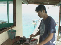 浩嗣さんの養殖場は、ポリネシアの首都パペーテから飛行機で1時間ほどのライアテア島を経て、さらに定期船で1時間。タハア島近くの海の上にぽつんと浮かぶ小屋だ。妻子が住む自宅はライアテア島にあるが、平日はこの小屋でたった一人、黒真珠の世話をしながら暮している。冷蔵庫もなく電気はソーラー発電、生活用水は雨水を使う。訪ねて来る人もない孤独で過酷な生活だ。