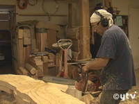 守行さんの彫刻は、ログハウスの柱や梁に直接彫ることが多く、一本の丸太から彫り出したアライグマや、ログハウスのシンボルとして飾られるタカのモニュメントなど、主に動物がモチーフになっており、愛らしい表情とユーモアが特徴だ。動物のリアルな表情や仕草は、資料を徹底的に調べて作り上げるという。チェーンソーからノミまで、さまざまな道具を駆使して木を彫り、微妙な表情などは細かな細工が出来るマイクロカーバーという機械を使って、何百種類ものヘッドを付け替えながら丁寧に彫り出していく。守行さんはこのような彫刻の技術をすべて独学で身につけたという。