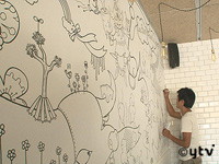 佳久さんが絵を描くのはホテルやレストランなどの壁。使う道具は絵具ではなく油性のペンだ。モチーフにするのはユーモラスな動物や植物など。それは幼い頃によく自然の豊かなところへ連れて行ってくれた母の影響が大きいという。デッサンや下描きは一切なく、その時のひらめきを大事にしながら、イマジネーションの赴くままにペンを走らせるのが彼のスタイル。佳久さんは「絵のルーツは母と描いた絵描き歌の“タコ入道”」という。「僕の絵にはストーリー性があるので、子供たちがそれを見つけて話題にしてくれたら。僕は本当に楽しんで描かせてもらっている。そういう気持ちが伝わればいい」と語る。