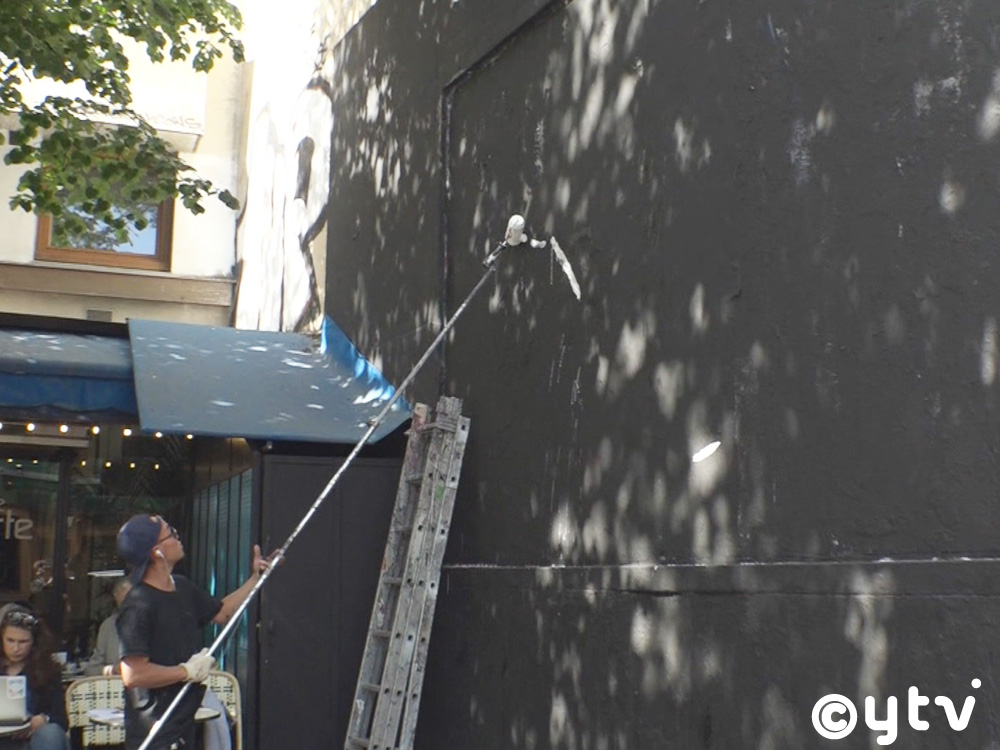 博泰さんは、パリでの初個展を控え、自宅のあるドイツ・ベルリンを離れてフランスに滞在している。絵画や版画、彫刻などさまざまな作品を手掛ける博泰さんだが、中でも得意とするのが巨大なストリートアート。スプレーなどで文字を描く無許可の落書きとは違って、持ち主の許諾を得て壁などに描くものを「ストリートアート」と呼び、ヨーロッパでは芸術の一つとして認識されている。これまで、時には16階建てのビルの壁面にロープで吊られながら、時には大型重機を自ら操縦しながら、圧倒的なスケール感をもって命がけで創作活動を行ってきた。今回は個展の宣伝も兼ね、おしゃれなカフェが並ぶメニルモンタン通りに立つ高さ4m、幅10mもの巨大な壁をキャンバスにする。博泰さんが壁画を描くときに心掛けるのは「まずは自分がその街を知る」こと。事前に作品の舞台となる街を歩き回り、その土地の文化や歴史を必ず盛り込む。今回のテーマは、郊外に生息する生き物の調査票に記載されていたという言葉「パ・ディ・ベルナージュ」=今回は帰ってきていない。かつてはフランス全土で見ることができた鳥「イグレット」を、ローラーを巧みに動かしながらペンキで描き出していく。