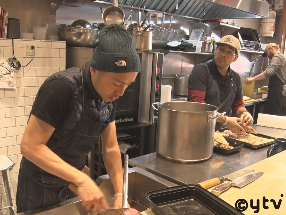 ニューヨークの中心地、マンハッタンからイーストリバーを渡ったところにあるブルックリン地区は、高級住宅街が続く昔ながらの閑静な街。この地で雄次さんは鮮魚店「OSAKANA」を経営している。ニューヨークの一般的な鮮魚店で売られる魚は加熱処理を前提としたものがほとんどで、刺身専用の魚を扱う文化そのものがなかったという。そこで雄次さんの店では、ケーキを売るディスプレイを魚用に改造し、湿度と温度を管理したショーケースで刺身を販売。さらに、店に来てもらうきっかけとして魚のさばき方や寿司の握り方を教える料理教室を開催し、ニューヨーカーに人気を博している。この店を始めて2年半、今では家で刺身を楽しむ人が増えてきたという。そんな鮮魚店から歩いて5分の場所には、雄次さんが経営し、「23歳の時に思い描いた僕の夢のレストラン」だと言うこだわりの和食店「OKONOMI」が。朝は鮮魚店のキッチンでさばいた魚を持ち込んで、焼き魚定食を販売。夜は仕込みで残った魚のアラをスープにした「ツナコツラーメン」を看板メニューに、一匹の魚から無駄を出すことなく美味しい料理を提供している。