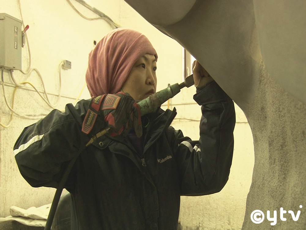 2016年、極寒のアメリカで彫刻家として奮闘していた吉野美奈子さん(当時48)。ニューヨークの街から車で3時間、湖と木々に囲まれた自然豊かなペンシルバニア州で制作に打ち込んでいた。普段はニューヨークで暮らしているが、彼女の作品に惚れ込んだ石材会社の社長による支援で、会社の一角を作業場として間借り。社員もアシスタントを務めてくれているのだ。現在は、ニューヨークを流れるハドソン川の“主”であるチョウザメをモチーフにした巨大な作品を彫っている。大勢の人の協力を受けながら、およそ18トンもの巨石と格闘して既に半年。完成のタイミングは石が教えてくれるのだという。「石に“もう美奈子、じゅうぶん”と言われるまでやる。ありがとうと言われる瞬間があって」。このチョウザメは99%まで完成しているそうで、「もう、早く外に行きたいみたい」と笑う。