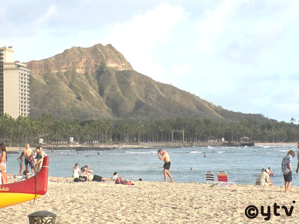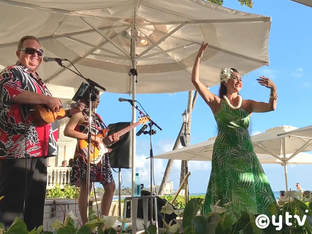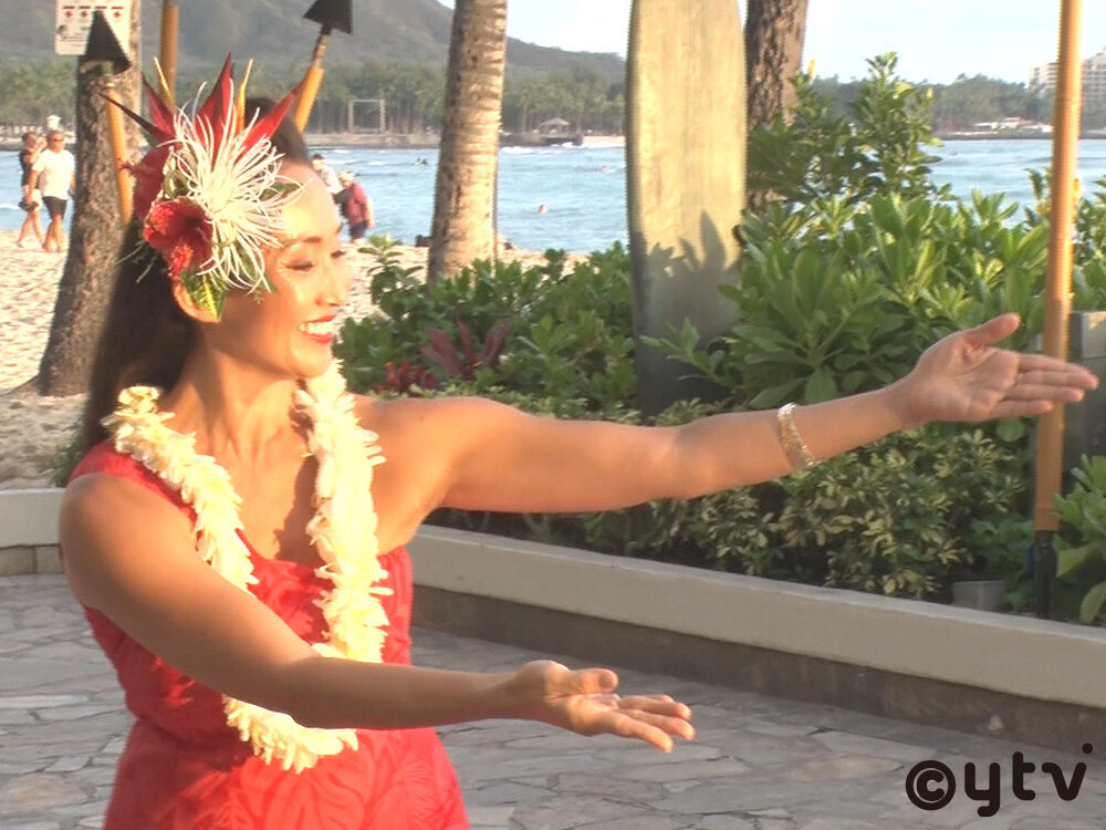普段はワイキキ最古の格式あるホテル「モアナ・サーフライダー」でのフラショーに出演する由美子さん。しかし3月中旬から新型コロナウイルスの影響で全てのレストランのショーが中止になった。観光客が激減しエンターテインメントが軒並みキャンセルされる中、現在の仕事は週に一度任されているホテル「アウトリガー・ワイキキ・ビーチ・リゾート」でのウェルカムフラショー。エントランスで2時間休みなく踊り続けお客さんを出迎える姿は優雅にも見えるが、「膝を曲げて常に中腰で踊っている感じ。顔は笑顔ですけど、体はボロボロ」と苦笑する。