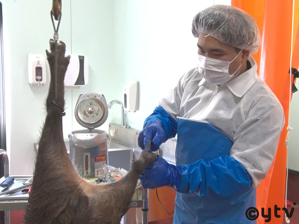罠の設置には狩猟免許と専門知識が必要なため、農家からの依頼を受けた拓哉さんが行う。イノシシの生態を理解しないと捕獲は難しく、技術のほとんどは師匠的存在である猟友会の山本さんに教えてもらった。あるとき、罠に掛かっていたのは3頭の幼いイノシシ。子どもでも数カ月もすれば畑を食い荒らすようになるため、電気止めさし機という装置で息の根を止めなければならない。電気が流れる槍を手に、「自分が“止めている”のを感じる。慣れることはこの先もないんじゃないかな」と拓哉さんはいう。ただ、これまでの獣害対策では捕獲されたイノシシは埋められているだけだったが、昨年から拓哉さんの会社「ジビエファーム」でジビエとして出荷することを始めた。加工技術を一から勉強して覚え、イノシシ肉をインターネットで販売。その収益で会社を運営しているが、まだ順調とはいえないという。日々の活動が地元で感謝され期待される反面、葛藤も。「ジビエファームでイノシシが解体されなくなり、自分の仕事がなくなるのが一番の理想」。誰かがしなければいけない仕事だが、それが自分なのか…その答えはまだ見つかっていない。