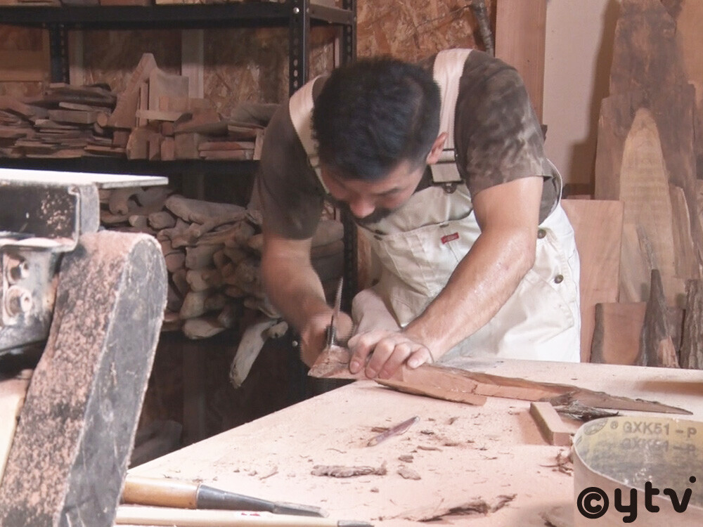 地元の木材を使って、キッチン雑貨やインテリアの装飾品など一点ものの作品を作る純一さん。ショップと工房を併設する自身のアトリエ「KOSHIRAERU(コシラエル)」は間もなく完成予定で、食品を扱う商店だった祖父の家を自らリノベーションしている。工房には、様々な種類の木材がずらりと並ぶ。新品は使わず、裏山の川に流れついた流木や、近所の人から譲り受けた廃材を活用するのが純一さんのやり方。すべて手作業で、それぞれの木と対話しながらイメージした形に削り出していく。だが時にはうまくいかず、別の木材で一からやり直すことも。そんなこだわりから生まれる作品は全国から絶え間なくオーダーが入るため、現在は納品まで数カ月待ちという人気ぶりだ。