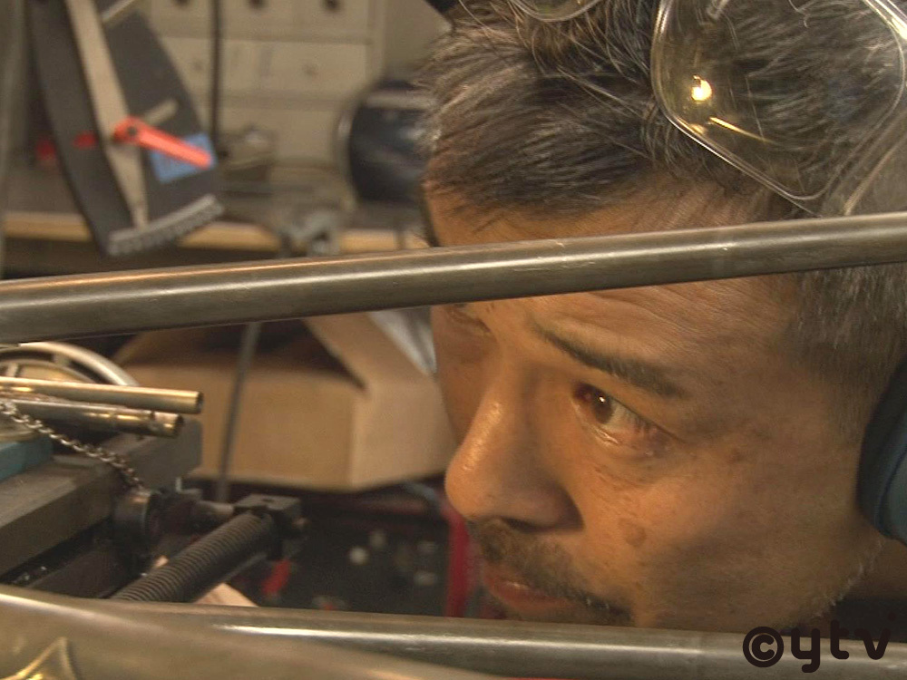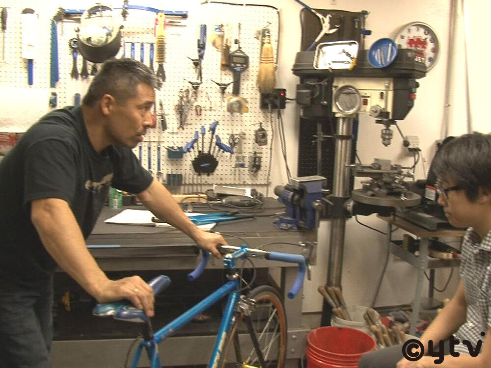 自宅のガレージを改造した作業場で、ハンドメイドで製作しているのは、自転車のフレーム部分。「今は、チタン製やカーボン製で軽くてよく走る自転車もあるんですけど、自分が作るのはスチールでできた昔ながらの自転車。これにはこれの良さがあるから、私のところに来るのは “シンプルでよく走る自転車が欲しい”っていうお客さんですね」。フレームはまさに自転車の要であり、その良し悪しが乗り心地や性能を決める。そこでオーダーするお客さんからパイプの太さや材質など細かな要望を聞いた上で体を採寸し、使用目的に合わせて、背中の角度など20カ所近くをチェックする。それらを基に作成した設計図に従ってパーツを作り、溶接。ミリ単位の誤差が自転車のスピードを大きく左右するが、競輪選手だった経験が精度の高いフレーム作りに役立っている。