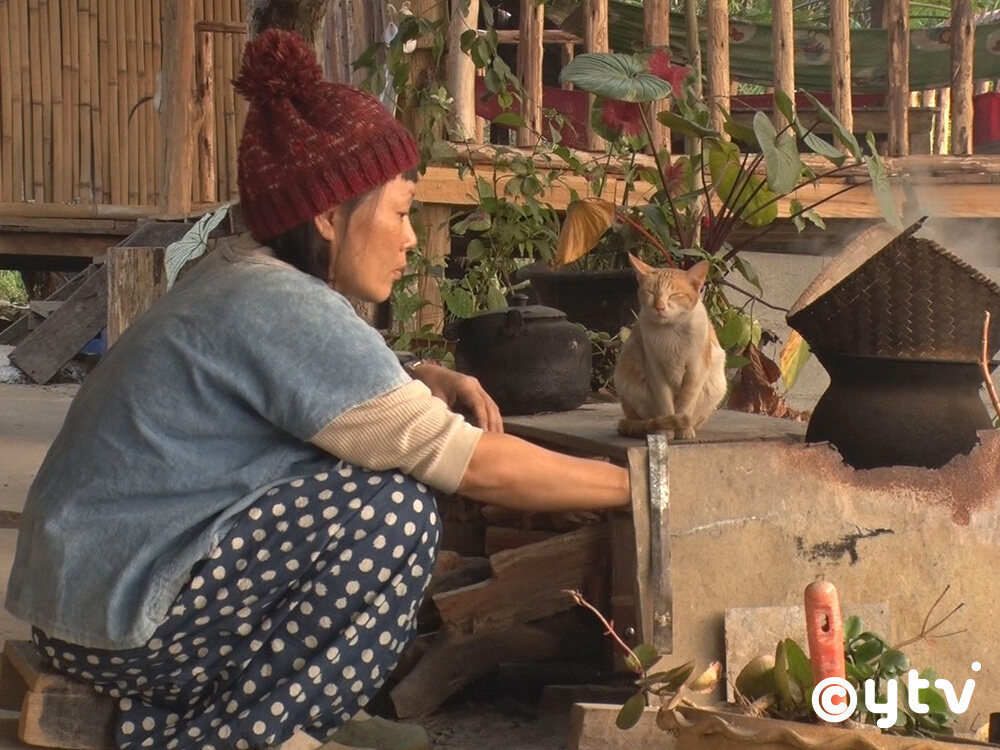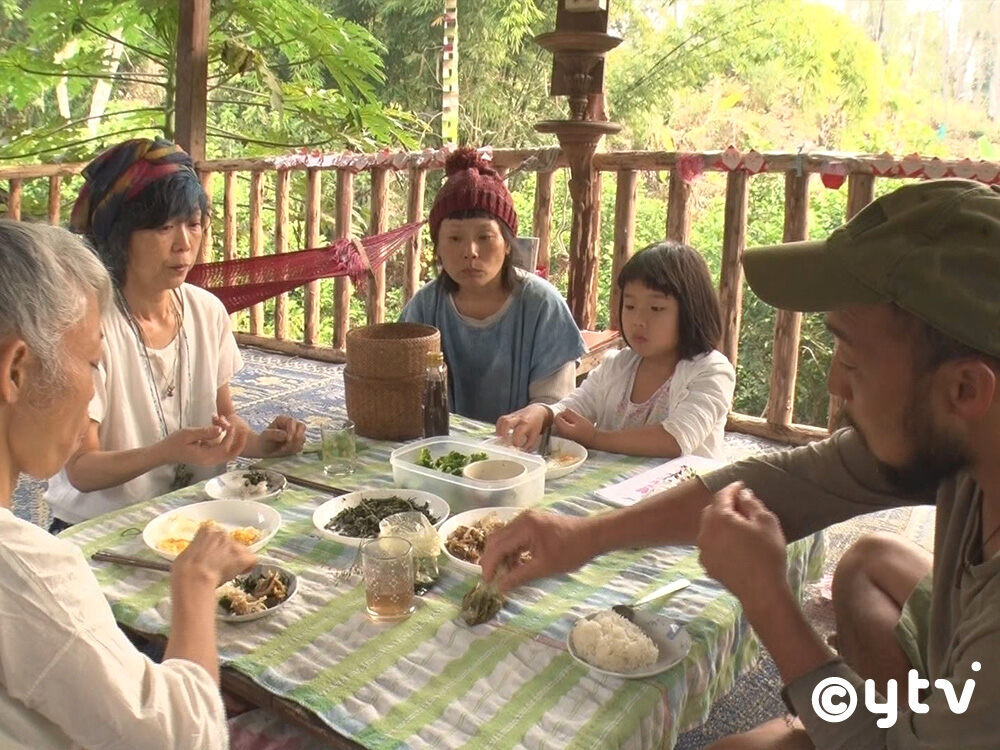 朝7時、明子さんがかまどでもち米を炊くところからゲストハウスの1日が始まる。周辺に良い香りが立ちこめると宿泊客が自然と集まり出し、明子さん家族と一緒に食卓を囲む。夕方にはお客さんを連れて町へ降り、週に一度開かれるマーケットへ。タイならではの食材がずらりと並ぶ中、それぞれで好きな食材を買い込んでパパイヤヴィレッジに戻り、夕食を楽しむ。こんな賑やかな食事ができるようになったのは実に3年ぶり。コロナ禍の間は収入が無くなり、危機的状況に陥ったこともあった。そのとき家族を支えたのは、カム族として育ったシンさん。無一文になっても動じず、山に入ってタケノコからモグラまで様々な食材を調達してくれたといい、「無敵やなと思います。シンがいなくなったら私はここに住めないですね」と明子さんは言う。