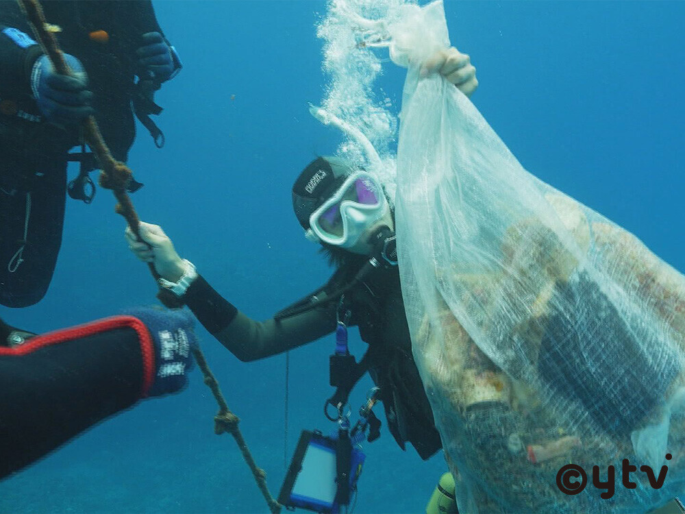2022年、恐らく日本で初となる水中ゴミ拾い専門のダイビングショップ「Dr.blue」を起業した真七水さん。開業して1年、まだ余裕もないため、事前の準備から水中でのガイド、後片付けに至るまですべて1人でこなしている。一見すると岩や砂と見分けがつかないが、海の底にはペットポトルや空き缶、タイヤなど様々なゴミが溜まっている。中にはサンゴに絡まった漁網や釣り糸も。お客さんとともに海に潜った真七水さんは魚たちには目もくれず、海中のゴミを探し出しては回収していく。このゴミ拾いに参加できるのは、アドバンスト以上の免許を持つ経験豊富なダイバーのみ。それでもゴミ探しに夢中になって離れてしまう危険性があるといい、常にお客さんの位置には注意を払いながらガイドしている。ゴミの中には年代物の空きビンや時代を感じる日用品などもあって、宝探しのような楽しさも。真七水さんはこうした活動を新たなマリンアクティビティとして捉えているという。