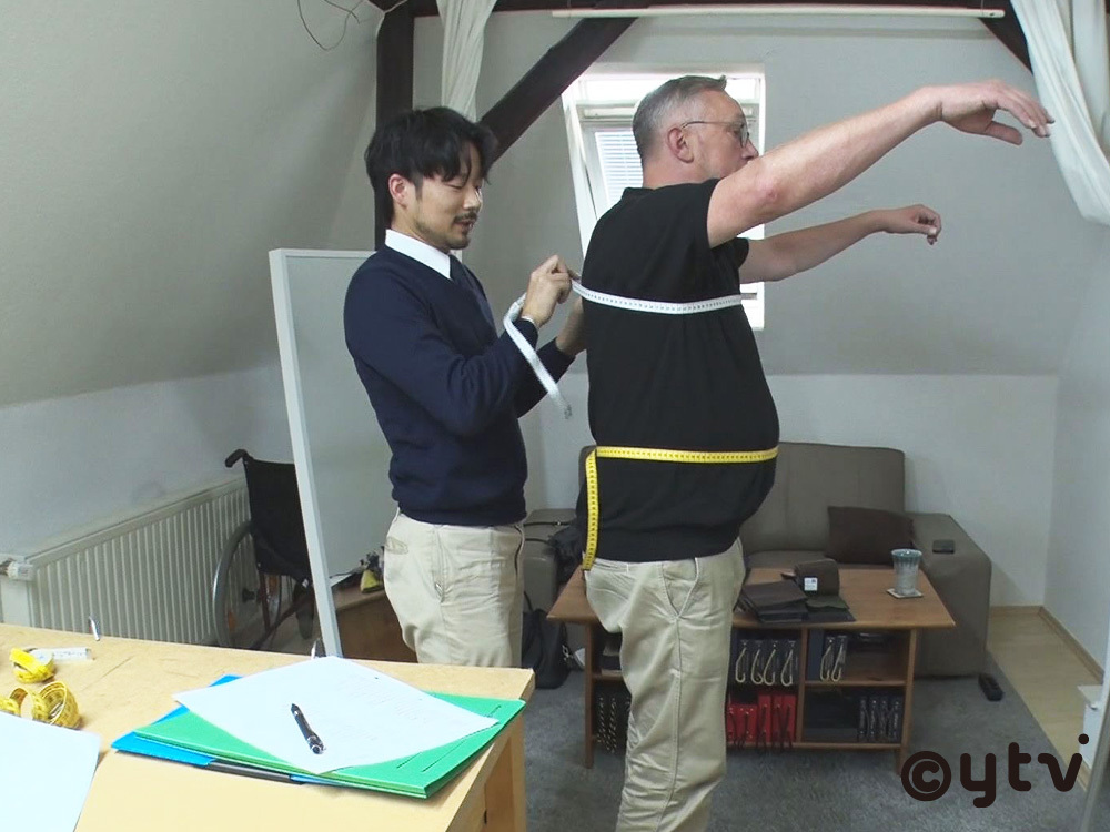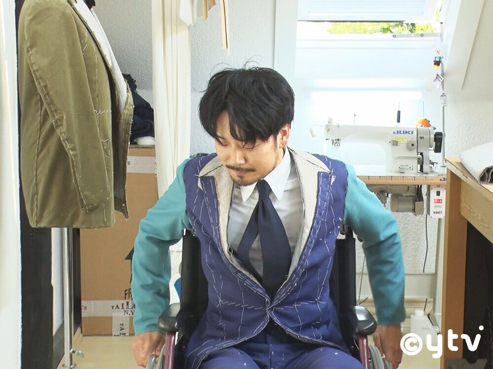真至さんの工房の棚には、息子の身を案じる母が毎年送ってくれるたくさんのお守りがある。実は真至さんは20歳のときにバイクの事故で足を大けがし、一時は命の危険も。骨や神経をつなぎ合わせる大手術の末、奇跡的に足の切断は免れたものの、10回以上の手術と長期の入院生活を余儀なくされた。この頃、人生に希望を見出せなくなっていた真至さん。そんな息子のため、父と母は自宅がある兵庫県から入院先の大分県まで駆けつけ、泊まり込みで看病。さらに両親は夜なべをして真至さんのパンツを直し、大きな装具を付けた足でも脱ぎ着できる形にしてくれたという。この経験から、真至さんは障害がある人のために着心地のいい服を作りたいと、新たな道を目指すように。22歳から松葉杖をつきながら服飾学校に通い、リハビリと並行して貪欲に服作りを学んだ。2015年、27歳でドイツへ。こうして11年にも及ぶ修業の末、2021年、33歳のときに超難関の試験を突破。テーラーの最高峰であるドイツの紳士服マイスターの資格を取得したのだった。
