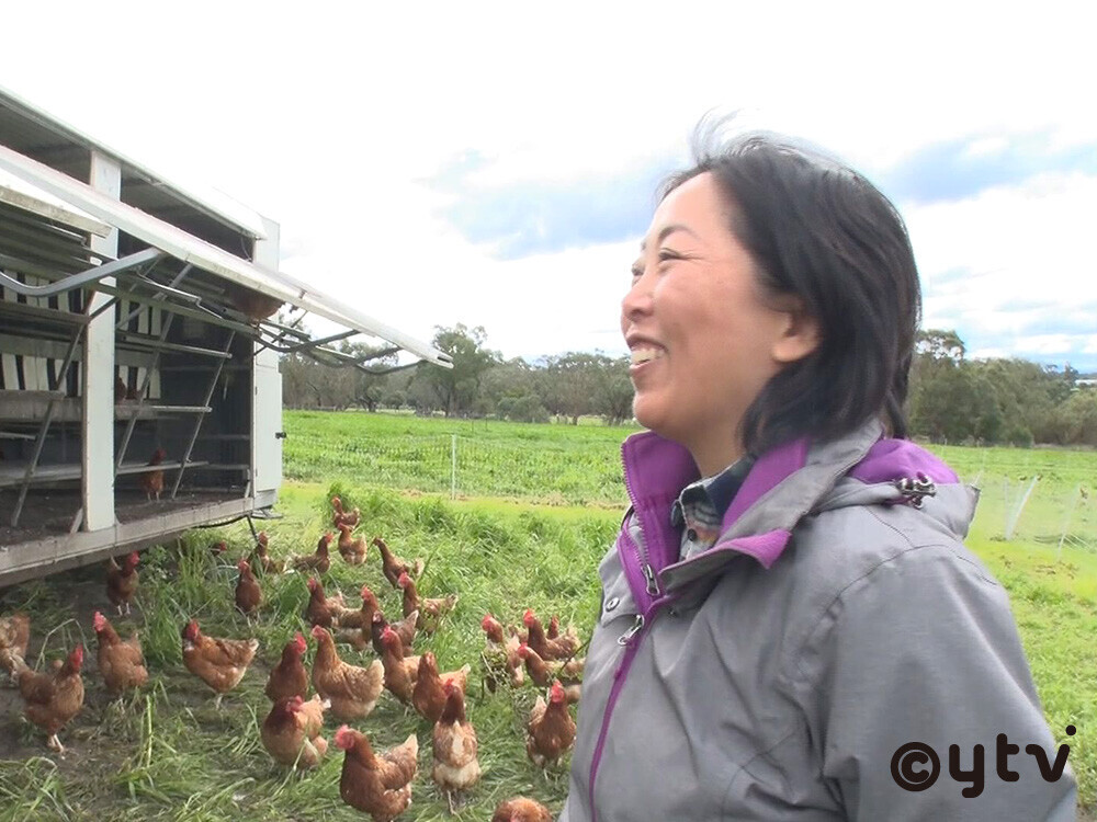 大学時代、留学先の中国で源蔵さんと出会った久美さん。その後、2002年に源蔵さんの母国であるオーストラリアに移住した。そして田舎暮らしに憧れていた久美さんはファームを購入。仕事をしながら趣味としてファームを楽しもうと考えていたが、そのとき自分たちが食べる卵のため鶏を3羽飼ったのが全ての始まりとなった。すぐに草を食べ尽くしてしまう鶏の飼育に悩んでいたときに偶然見つけたのが、移動式の鶏小屋。食べる草が少なくなると、トラクターで鶏小屋ごと大移動して新しい場所に引っ越すというもので、鶏たちはずっと新鮮な草をついばむことができる。そんな方法に久美さんは「これをやりたい」と一目惚れ。農業の経験は全くなかったが源蔵さんも賛同し、2013年、2人で卵農家をスタートさせたのだった。ただ、今の仕事には満足しているものの、休むことができないため日本には8年も帰国していない。また、親孝行ができていないことも気に掛けている。