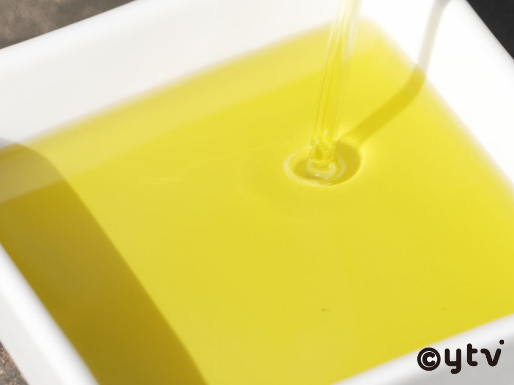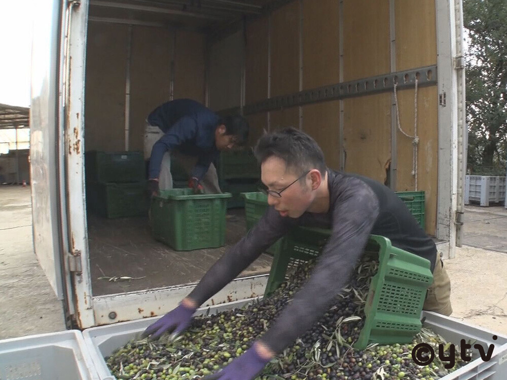 収穫期を迎えたこの日、佳裕さんは朝8時から現地の日本人スタッフと共に作業を始める。最近は日本でもオリーブ栽培に挑む農家が増えていて、スタッフの中には日本人研修生の姿も。専用の機械を使って実を落とし、地面に敷いたネットや布で回収するという伝統的な方法で、紫色の完熟した実と若い緑色の実をまとめて収穫していく。オイルの味は熟した実と若い実の比率によって決まるといい、佳裕さんはスパイシーでストロングな風味がする緑の実を多めに収穫しているそう。また実が熟しすぎると理想の味にならないため、2週間で800本全ての実を収穫する。こうして夕方までひたすら作業して、1日で採れる量は多い時で約250キロ、オイルにすると25リットル分ほど。しかもオリーブオイルは鮮度が命なので、収穫した実はなるべく早く隣町にある搾油所まで運び入れる。手塩にかけて育てた実が腕利きの職人によって絞られると、美しいオリーブオイルが完成。その場で試飲した佳裕さんは、「最高です」と納得の表情を浮かべた。