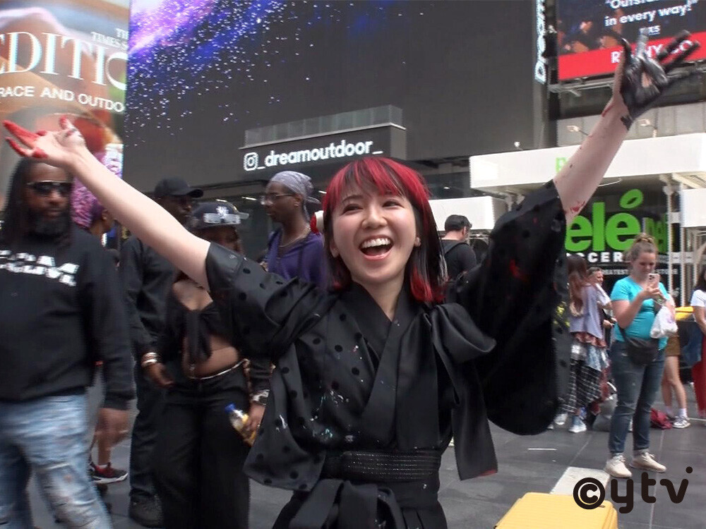 ある日はパフォーマンスを行うため、多くの観光客でにぎわうタイムズスクエアにやってきた。「ぶちかましたい」と意気込む愛梨さんは、縦2メートル・横3メートルもの和紙を広げ、大きな筆で何かを書き始めた。完成したのは、ブレイクダンスをする自由の女神の絵。「一人一人がヒーローなんだ」という意味を込めた作品には、「放つ」という漢字と、「HERO」という英語が散りばめられていた。