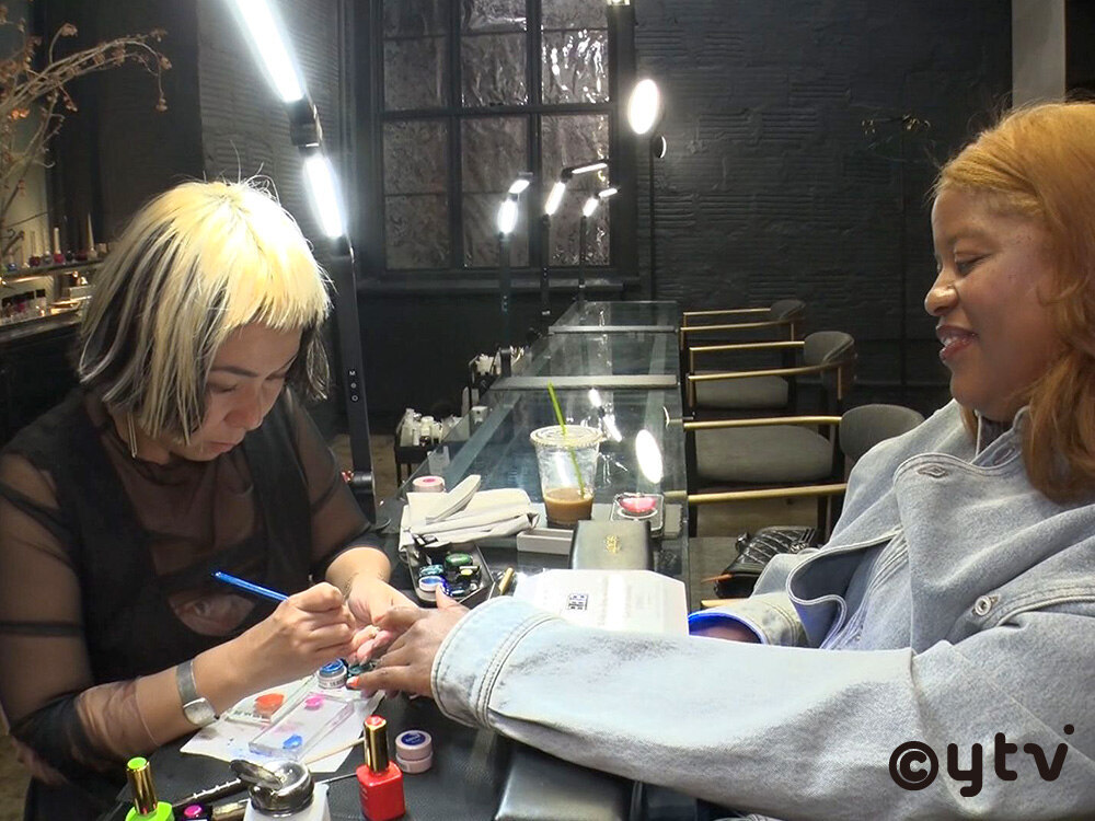 日本と違い、自分の要望をしっかり主張するお客さんが多いニューヨーク。何度も確認しながら仕上げても、最後に「やっぱり好きじゃない」と言われたこともあったというが、それでも「それを汲み取れなかった自分の実力不足なので、やり直します。私の店は“来たときよりもハッピーでお客さんが帰る”っていうのがモットーなので」と静香さん。この日やってきた10年来の顧客からも、10本の爪それぞれに細かなデザインの要望が。静香さんはベースとなる爪を整えたうえでデザインを爪1本1本に落とし込み、美しくかつ手早く仕上げた。これを2時間半ほどで終えられるのはその確かな技術があってこそだ。また別の顧客に施したのは、爪に本物のダイヤモンドを埋め込む「ダイヤモンドネイル」。アメリカ唯一ともいわれるこの施術には高度なテクニックが必要とされるが、「日本のネイルの技術は世界一だったけど、今は他の国に追い越されている」と危機感を持った静香さんが、他店との差別化を図るべく取り入れたという。