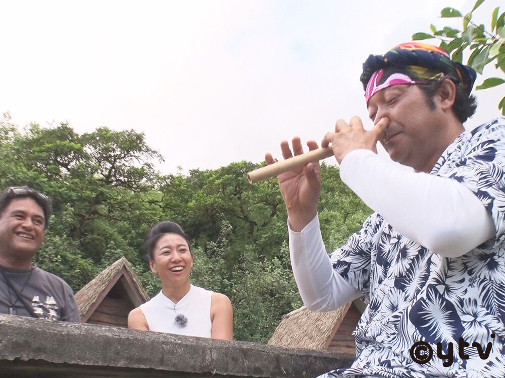 ようやく到着したファレハペには、宿泊ができる古代住居やタヒチの伝統文化が体験できる施設が。ぐっさんはここで、アヒマアと呼ばれるお祝い事には欠かせない料理を体験する。さらに、伝統楽器の鼻笛・ビボに挑戦。最初は苦戦するも、カメさんから吹き方のコツを教わったぐっさんは、見事に美しい音色を奏でる。