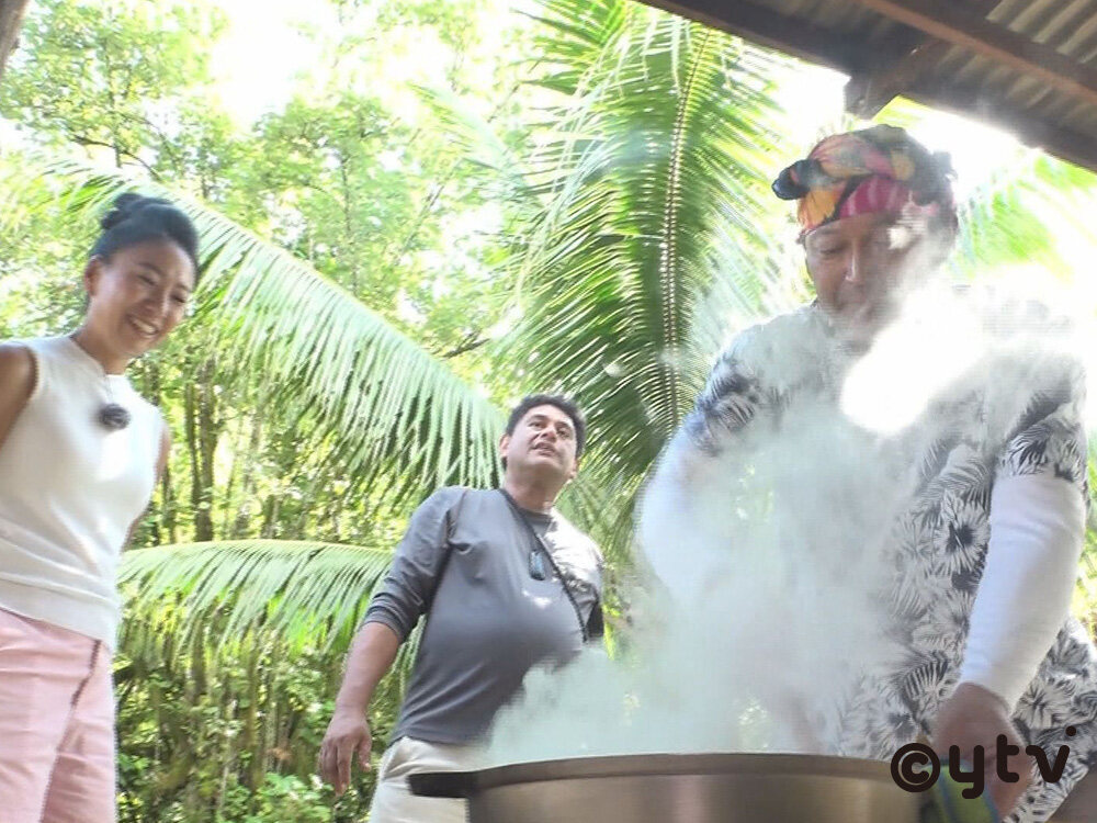 首都・パペーテの街中から車で30分。ぐっさんが赴いた場所では、大勢の人とともに亜希さんがステージに立ち、タヒチが乾季に入るためのセレモニーを行っていた。彼ら「ハウルル」は、フランス文化の影響で失われつつあるタヒチ本来の伝統や文化を保全するボランティア団体。亜希さんは6年前から活動に参加し、地元民や観光客に向けこうしたセレモニーやイベントを定期的に行っている。