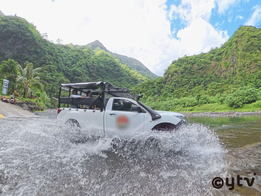 ぐっさんは、亜希さんとカメさんの案内で聖地・ファレハペを訪ねることに。ファレハペがあるパペノオ渓谷は、ハウルルが保全活動を行っている自然保護区。熱帯植物に覆われた1500メートル級の山々からなり、面積は実にタヒチ島の約10%を占めている。舗装されていない過酷な山道の途中にある石の祭壇・マラエではこの時期、雨季から乾季へ移るための儀式が行われる。こうした伝統行事が途絶えないよう続けることもハウルルの大切な活動の1つなのだという。