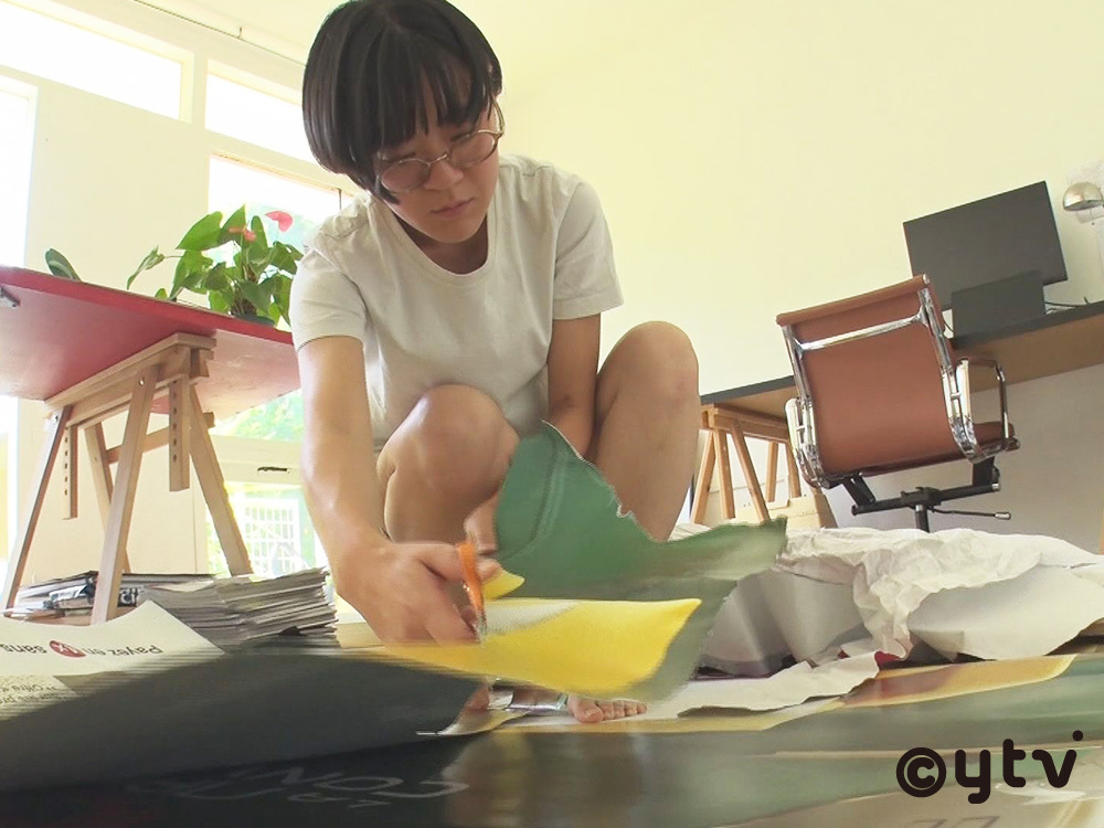 首都パリの隣に位置するムードンに住居兼アトリエを構える千里さん。雑誌やポスターなどからパーツを切り抜いて貼り合わせる、いわゆる「コラージュ」という技法で作品を作っている。例えばある作品で表現した山は、元はファッション雑誌に掲載されていたスカートの一部を切り取ったもの。この作品は日本の文芸誌の表紙に起用された。他にもファッションビル「パルコ」のショーウィンドウなど大きな仕事も手がけてきたが、本格的にキャリアをスタートしたのは2024年から。今年は仕事がほとんどない状況で、しかもフランス在住ながらフランス人からの依頼はほぼないという。そこで、渡仏6年目にして初めて個展を開くことに。作品作りのために訪ねた地元の図書館では、処分される古い雑誌を譲ってもらった。使い終わって捨てられる物だけでコラージュを作るというのも千里さんのこだわりだ。続いては映画館で、公開が終わった映画のポスターを譲り受ける。さらに向かったのは地下鉄。大きなポスターが定期的に貼り替えられる地下鉄はずっと狙っていた場所で、折よくポスターを剥がしているところを手伝わせてもらった千里さんは、なかなかない大きさの紙を手に入れ大喜びする。