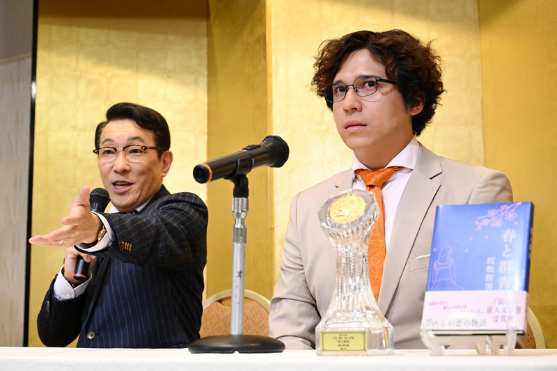 ついに今夜23:59スタート! 今夜放送の第1話は、小説家を目指す枝松脛男(木村昴)が、小説「青と群青」で、ついに新人文学賞を受賞し、表彰式会場でおどおどしながらも喜びの言葉をスピーチするシーンから物語がスタートする。