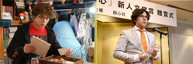 <第一話で枝松脛男(木村昴)が偶然手に入れた小説を盗作し、新人文学賞を受賞してしまうシーン>