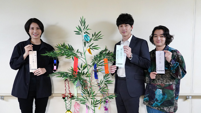 物語の中では、どんな願いも叶えるアプリCODEに翻弄される3人が、短冊へ思い思いに「願い事」を書き込んだ!ドラマの中ではアプリCODEを使って願いが叶えられると代償が発生するが、この日は代償が発生しない七夕という事で、終始笑顔で短冊と向き合う3人。「誰も怪我なく乗り切れますように」(坂口)、「健康第一!!」(染谷)、「刺繍ができるミシンが欲しい!!」(松下)とそれぞれのまっすぐな願いが込められた短冊が、撮影現場に設置された笹に掲げられた。緊迫感溢れる展開が続く物語とは一転、和やかな雰囲気で撮影が進む現場の空気感が伝わってくる「七夕オフショット」を本リリースにてお届け!