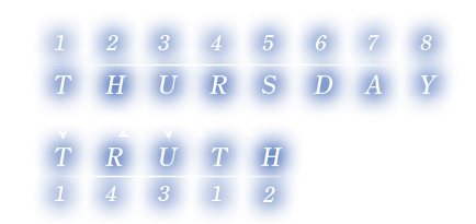 8月25日のドラマ放送で公開されたヒント④をもとに、「THURSDAY」から文字を拾います。