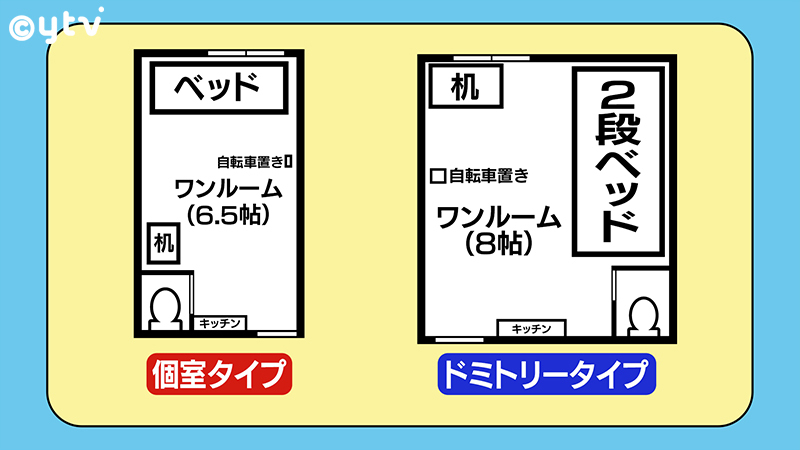 ワンルーム6.5帖の個室タイプと、ワンルーム8帖のドミトリータイプあり!自転車設備場や自転車洗車場を完備し、全部屋にディスプレイ用の自転車ラックを備えた、自転車乗りの為のシェハウスの物件です!