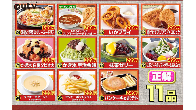 全110品中、正解は「海老と野菜のクリーミードリア」「揚げたてアジフライ&コロッケ」「パンケーキ&ポテト」など、計11品でした!
