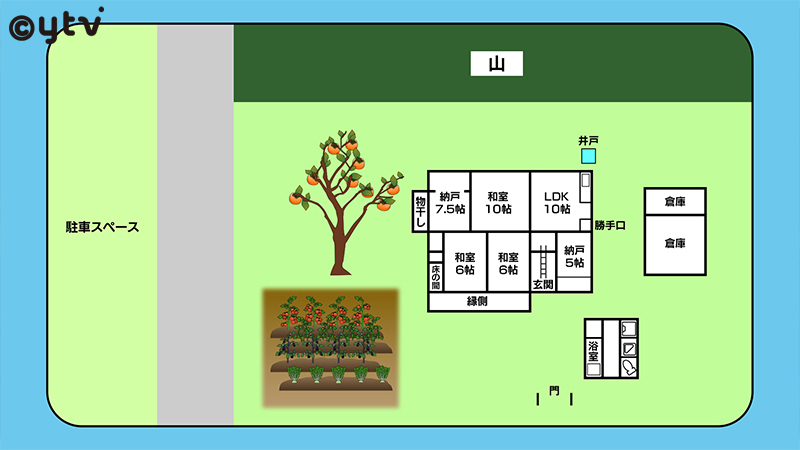 間取りが3LDK+2納戸+別棟+倉庫。裏山も含めると敷地はおよそ1100坪!