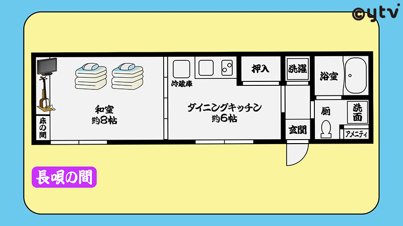 物件は長屋の一軒『長唄の間』常磐津節の女師匠をイメージした部屋。