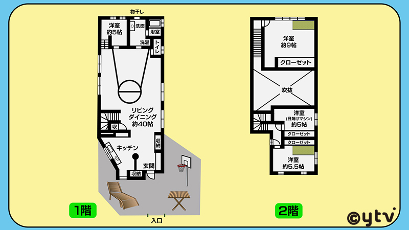 1階の40畳リビングダイニングは、天井高7mもあり体育館のようなバスケットコート付き!(※現在、バスケットゴールはシャンデリアに変更しているが付け替え可能)壁には芸術家の卵であるオーナーの息子さんが手がけた色彩豊かなペイントが施されていたりして眺めているだけでも楽しめるようになっている。さらに、2階には“日焼けマシン”を完備した洋室があり、小枝所長もギョーテンの物件です!家賃は15万円です。