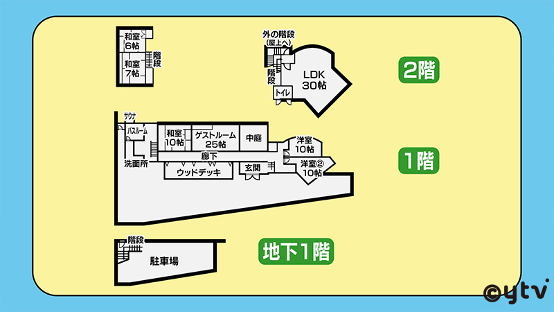間取りは6LDK。大きな観音開きの玄関扉を開けると、畳敷きの廊下の向こうに広がる見事な中庭に圧倒!そこから畳廊下を進むとゲストエリアになっていて、25畳もあるゲストルームや、庭園に面した広いウッドデッキなど、まるで高級旅館のようなスペースが広がる超豪華物件!