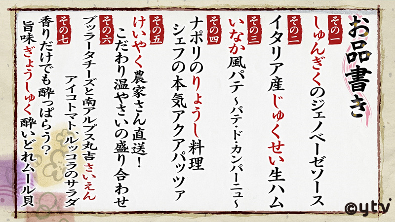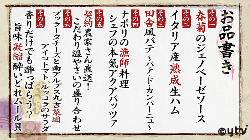 今回は、大阪市北区にある人気居酒屋「イタリア食堂 タベルナ エントラータ堂島店」のメニューから7品をピックアップして出題!