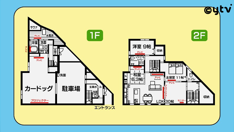大阪府松原市にある【集大成の家】をリポート!1階にあるガラス張りのショールームのようなガレージにはフェラーリが置かれ、その内装も白×黒チェス盤模様の大理石調フロア、ソファは鮮やかなイエローの革張り、手洗いの洗面ボウルは金ピカのゴールド、そして真っ赤に塗られた天井には、オーナーが大好きなミラーボールが!さらに、2階3LDKの居住スペースにも、奇抜な謎のオブジェなど、さらにド派手でデコラティブなモノが満載!オーナーの趣味全開のギョーテン物件!販売価格は1億5,800万円です!