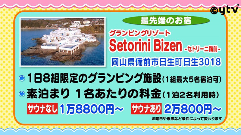 岡山県備前市の頭島にある<グランピングリゾート施設「Setorini Bizen‐セトリーニ備前‐」>【最先端のお宿】をリポート!海に突き出た岩場の上に建っており、まぶしいほど真っ白な建物群と目の前に広がる海の絶景はまるで外国のリゾート地にいるかのよう。宿泊は1日8組限定。8つあるドーム型のラグジュアリーな宿泊棟にはすべて屋内型BBQ棟とプールを完備。大きな窓の向こうに打ち寄せる波の音を聞きながらベッドに寝そべることのできる夢のような非日常を存分に味わえる【最先端のお宿】です。