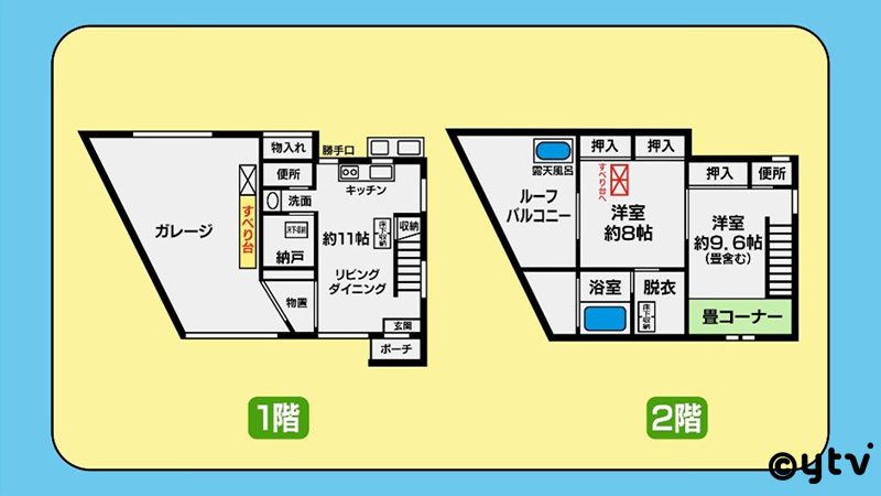 和歌山県日高郡由良町にある【しゅっとした イケてる家】をリポート。敷地面積およそ85坪、海を一望する見晴らしのいい高台に建つ築21年の2階建て一軒家で、間取りは2SLDK。押し入れや納戸、物置、床下収納など、やたら収納場所が多いこの物件。2階8帖の洋室の床にも床下収納があると思いきや、蓋を開けるとそこには…階下ガレージに“しゅっ”と滑れる“すべり台”付き。緊急時に身を守るためにオーナーが作ったそうです。販売価格は1,300万円。