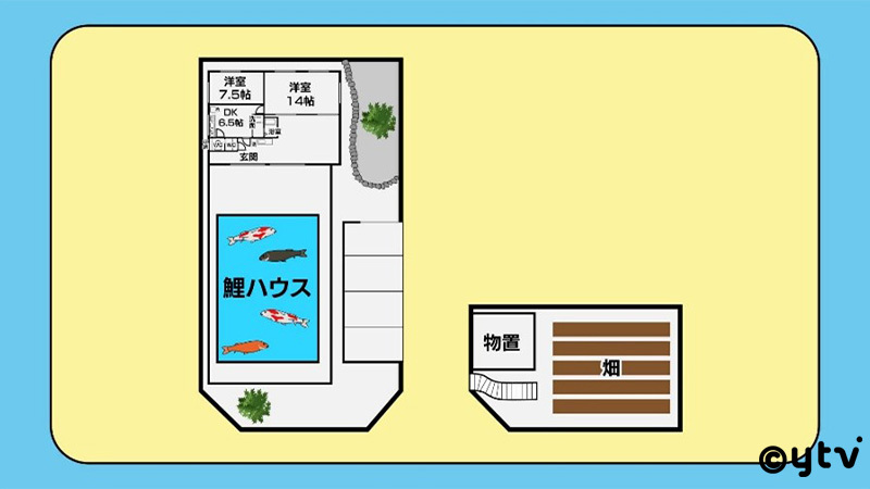 敷地は155坪と広いが、住居部分は敷地の端に建つ小さな2DKの平屋。敷地の大部分は、前オーナーが趣味である“鯉”を育てるために作った“温室ハウス”いろいろ“飼い”たくなる家!販売価格は3,500万円です。