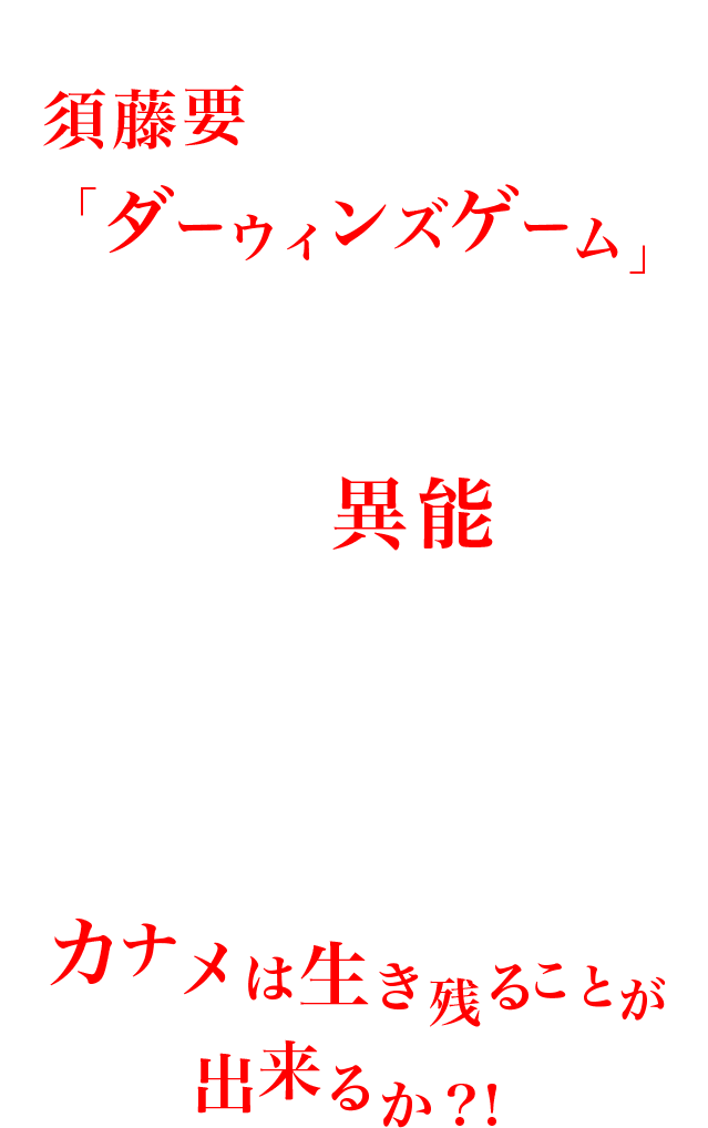 平凡な高校生である須藤要(←フリガナはスドウカナメ)のもとに見知らぬアプリ「ダーウィンズゲーム」の招待メールが届く。アプリを起動させてしまったカナメは、プレイヤー同士が異能(←フリガナはシギル)を駆使して戦うゲームに巻き込まれてしまう。わけもわからぬまま、襲い来る強力なプレイヤーとのバトルを切り抜け、カナメは生き残ることが出来るか?!