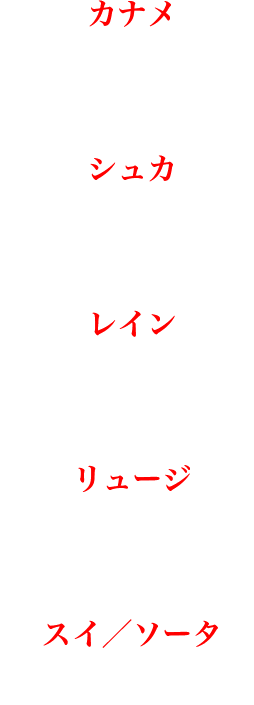 カナメ:小林裕介 シュカ:上田麗奈 レイン:大森日雅 リュージ:八代 拓 スイ/ソータ:花守ゆみり