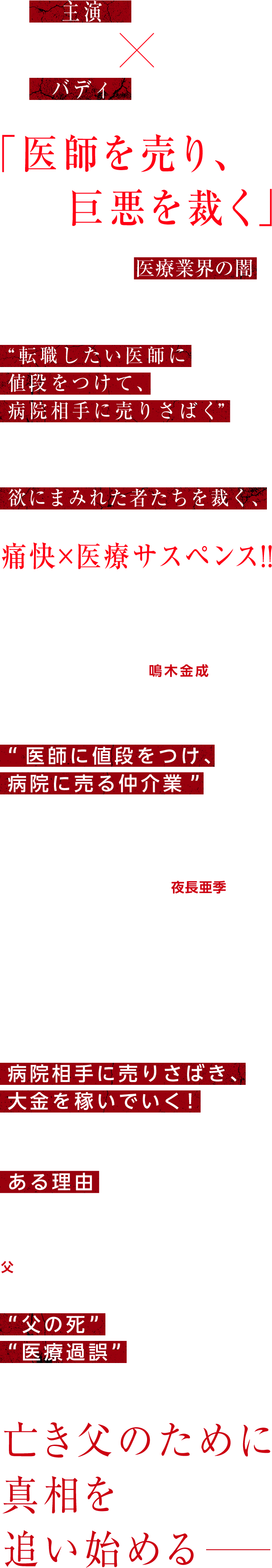 主演 岩田剛典×バディ 蒔田彩珠「医師を売り、裁く」父を自殺へと追い込んだ医療業界の闇を暴くため、メスもカルテも持たないひとりの男が立ち向かう─。転職したい医師に“値段をつけて売りさばく”通称:医師専門転職エージェント・鳴木金成。人と金と情報を操り、思わぬ方法で、欲にまみれた者たちを裁く、痛快×医療サスペンス!!「生涯年収が多い」という理由で、医師になった主人公・鳴木金成。その後、「もっと儲かる仕事を見つけた」と医師に見切りをつけた鳴木は、“医師に値段をつけ、病院に売る仲介業”通称:医師専門転職エージェントとなる─。毒舌だけど、計算能力・資料作成力などに長けた優秀な事務員・夜長亜季と共に、転職エージェント会社“Dr.コネクト”を立ち上げた鳴木。彼らは、医師という商品を、豊富な知識や情報、巧みな話術を使って、思わぬ方法で交渉を優位に進め、病院相手に売りさばき、大金を稼いでいく!しかし鳴木が医師を辞めたのには、ある理由があった。3年前、彼が医師だった頃……同じ極東大学病院で医師として働いていた父が医療過誤を起こし、同僚からも世間からも追い詰められて自殺。父の死に疑念を抱き、“医療過誤”に不審な点を見つけた鳴木は、亡き父のために真相を追い始める。