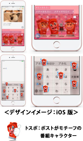 「Simeji」は累計1800万ダウンロードの実績があり、今回、その人気機能である「キーボードきせかえ」に「ダウンタウンDX」のトスポを基調としたデザインが登場します。また、エフェクト機能では、トスポが画面から降り注ぐデザインなどを追加。なお、本コラボレーションは、1月14日(木)より4月14日(木)まで(エフェクト機能は2月14日(日)まで)の期間限定の予定で無料提供します。