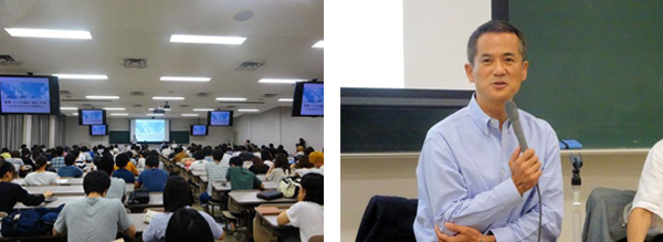 7月11日のミニシンポジウムには、パネリストとして報道局の春川正明解説委員長と読売新聞社の上田恭規論説・調査研究室長が参加し、「新聞・テレビの過去、現在、未来」をテーマに、それぞれの報道現場での経験と、現在のマスコミが抱える課題や果たすべき役割について、集まったおよそ200人の学生を前に語りました。