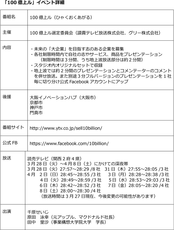 読売テレビ グリーと連携した企業応援プロジェクト「100億上ル」発足 - 次世代ビジネス創出を目指す企業参加型プレゼンテーションを実施 地上波とSNSで発信 -